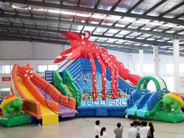 夏季移動水上樂園現場,各種各樣的充氣水上滑梯讓嬉水游客印象深刻,各種各樣的玩法讓人們流連不舍,面對造型豐富的充氣水上滑梯,你記得喜歡的是哪一款嗎? 來到移動水上樂園現場,吸引人、能夠抓住人們眼球的便是充斥著各種動漫卡通造型的大型充氣水上滑梯,如以大猩猩在林中搬運物體為主題的叢林探險,以彩虹為主題的彩虹水滑梯,以房屋為主題的連接水滑梯....它結合了時下各種流行的元素,色彩鮮艷亮麗,造型逼真,成為了移動水上樂園現場美的風景。由于充氣水上滑梯以充氣氣模為載體,屬于大型充氣游樂設備,因此其能夠起到強大的震撼效果。當人們從各種坡度的充氣水上滑梯滑入水池的瞬間,一個一個巨浪撲面而來,痛快絕頂,酣暢淋漓。 充氣水上滑梯可以和各種規格的移動式游泳池搭配,是移動水上樂園具備的設備,重要性不言而喻。由于充氣水上滑梯的高度不等,適合所有的年齡段人群游玩,因此不管是想要追求刺激、還是想要體驗一下從滑梯輕輕滑入水中的感覺,充氣水上滑梯完全能夠滿足游客嬉水游樂的需求。