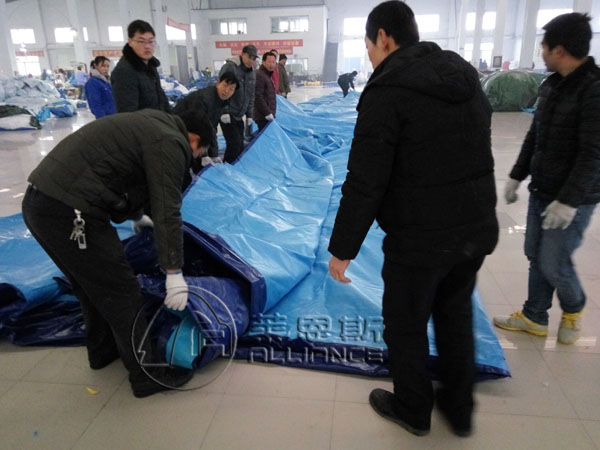 待氣體排靜后,將干煸的氣模布參考長寬比,一般從較短的寬度一側進行折疊,可以采用3折或4折方法,只要折疊后的寬度不影響更后裝車就行。折疊過程要注意不要方向一致,邊沿一條線,不要出現歪斜,然后從氣模玩具的前面(踩踏開始的地方)開始向風機口方向打卷,要保持兩邊的打卷進度一致,不要卷斜,否則打卷出現褶皺歪斜,容易造成布料磨損老化。