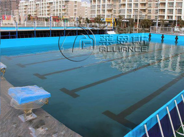 移動式游泳池也叫組裝式框架游泳池,是近幾年受歡迎的新產品,一般大型的室內外場地都采用此類產品。產品材料采用聚酯纖維雙面PVC涂層汽艇專用布,抗拉強度:經向3487N/5cm 緯向3089N/5cm;撕裂強度:經向1572N/5cm 緯向1514N/5cm。粘著力5150N,抗寒-30度、抗熱+60度(各公司產品參數可能不同)。移動式游泳池部分采用膠粘與高周波熱合工藝加工制作。具有氣密性好、強度高等特點。移動式游泳池上部邊緣為堅固鋼管,外側加裝高強度U形管固定??蚣苡境丶冗m合家庭別墅適用,也可適用于大型游樂場所。