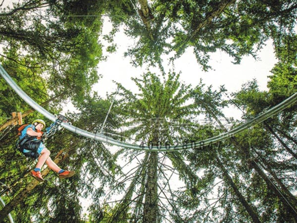 軌道滑索作為新興的游樂項目,被稱為極限運動。穿戴柔性吊具的乘客,懸掛在滑軌下,以彎曲的鋼梁為軌道,利用重力,從高處向低處飛速滑下,這就是軌道滑索。軌道滑索運動充滿速度感和刺激性,可以輕松跨越山谷、河流、湖面等障礙,讓乘客體會到凌空飛渡的新奇感受,因此深得游客,尤其是年輕人的喜愛。現在把它的獨特的原始感覺放于叢林山巔。