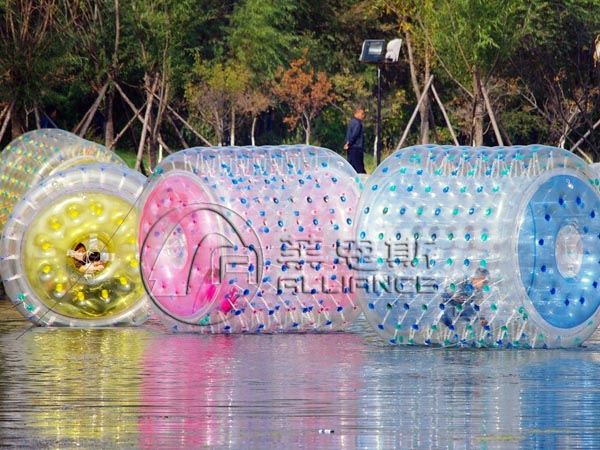 水上滾筒與水上步行球玩法類似,水上滾筒廠家在設計滾筒時,在筒的兩側留有側窗,可以方便游客進出和空氣對流,擺脫了步行球時間的限制,游客在步行球中可以按經線方向運動,步行球受摩擦力會在水上轉動前行。游客被裝在水上滾筒廠家設計“筒”中,兩側窗會用繩網系住,避免激烈游玩過程時人從筒中翻出。游客在里邊便如太空散步一般。