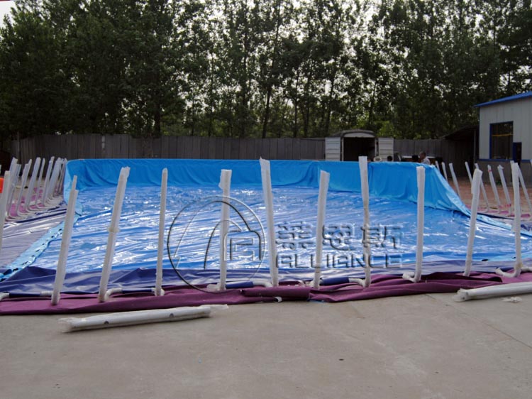 1、首先把要把泳池的場地清理干凈,不要有尖銳的異物,以免損壞支架游泳池底部;在移動泳池下面鋪一塊布,然后根據場地預留出支架的位子,把泳布鋪好;2、檢查穿布桿的兩端,是否有毛刺或臟東西,整理后,開始穿支架;3、先從對應的兩側面泳布把穿布桿穿入插接在一起,并把穿布桿的孔與泳布的孔對應;4、把支架對應的插入穿布桿的孔內,用支架桿插入穿布桿孔內,同時檢查支架是否與穿布桿連接結實;5、然后穿另兩側穿布桿,并逐一插接好。把穿布桿的孔與泳布的孔對應后,逐一把支架與泳布上的拉布連接起來,對應的一一插接好;6、檢查穿布桿及支架以及各連接點是否有問題,如無問題,則穿桿環節完成,可進行架池的步驟;7、推動穿布桿,立起支架游泳池側面的支架,把穿布桿盡量向泳池內推,調整好各側面支架的位置,但應注意調整支架位置時支架不要從穿布桿孔內脫離,以便照成不必要的麻煩。8、連接好水處理系統,裝上泳池扶梯,支架游泳池就安裝完畢了。