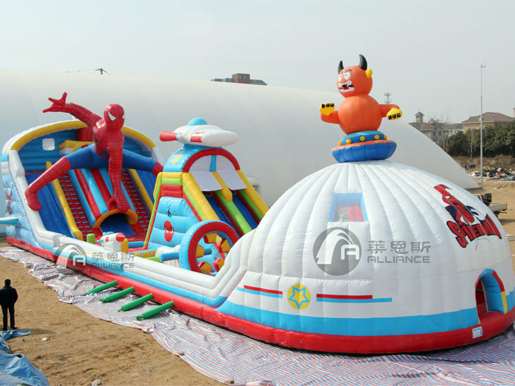 首先:使用材料,充氣城堡和充氣滑梯都是采用0.48mm的材質,但是滑高度和梯斜面需要更多布料,斜面鋪設滑布采用0.55mm的材質。第二:護欄高度,充氣城堡護欄高度在0.9米左右,充氣滑梯護欄高度在1.2m左右,高度不用,采用的布料多少也是不用的。第三:做工手法,充氣滑梯的整體高度要比充氣城堡高出很多,做工也要復雜很多.第四:充氣滑梯體積更大,需要風機配置功率和數量更多。 兒童充氣滑梯價格不同是由材料成本和工時決定的,好的產品更能滿足市場需要,收益更有保障。