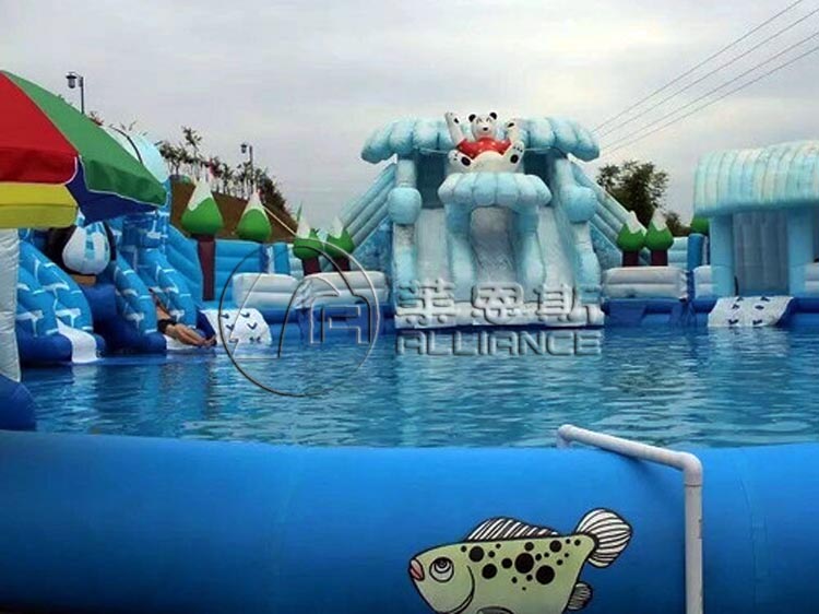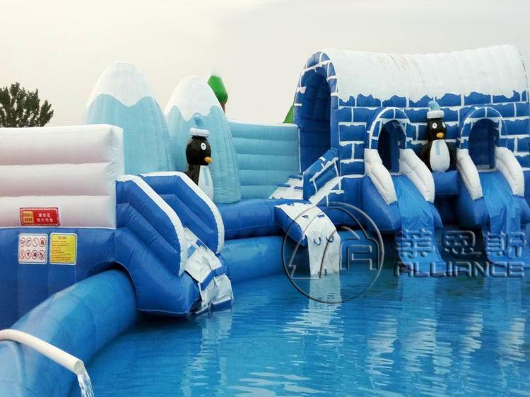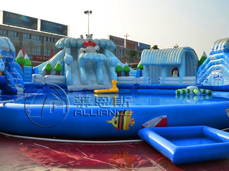 產品名稱:冰雪世界充氣水上樂園產品規格:20.3x20.3x6m配套水池:直徑16m充氣水池產品材料:一等環保夾網pvc配置:風機、布料、膠水充氣方式:連續性充氣使用壽命:10-12萬人次保修期:3年產品描述: 冰雪世界充氣水上樂園采用環抱形狀,兩側是環形攀爬、涵洞、滑梯、冰屋等冰雪造型,兩臂中間是冰熊造型,兩臂環抱直徑16米充氣水池。整個冰雪世界以白色雪景和藍色冰面為主,讓小朋友有置身冰雪世界之中的冰爽體驗。適合做為移動水上樂園設備。適合人群: 3-16歲兒童適用場地: 可用于城市廣場、公共休閑空地、公園、操場、景區、度假村、體育場館、城鄉結合空曠處和小河、湖泊、海邊等區域,無需基建,設施可移動組合,不長期占用、傷害場地。溫馨提醒 在購買充氣水上樂園時,您不但要考慮水上樂園設備價格,更要重視質量,優質的pvc材質能提高產品安全保障和使用壽命。