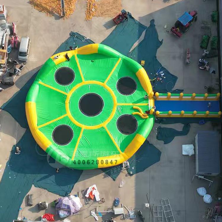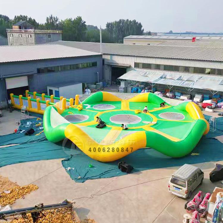 水上充氣蹦床橋由多個弧形波浪充氣胎合圍而成,充氣圈內張拉彈性膜布形成,其中有4張圓形彈力布小蹦床。游客通過連接橋進入荷葉蹦床,可以在蹦床上彈跳游樂。