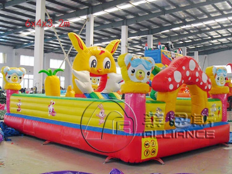 產品名稱:兔子充氣樂園產品規格:4*6*3.2m/5*6*3.2m/5*8*3.2m(長*寬*高)產品材料:0.48±0.02mm環保夾網PVC配置:風機、布料、膠水 供氣方式:風機連續供氣使用壽命:12-14萬人次保修期:充氣樂園整體提供三年質量保障,三年內免費提供布料,膠水。業務經理跟蹤服務,幫助客戶解決經營中出現的疑難問題。產品描述: 兔子充氣樂園充滿探險樂趣,內設鉆洞和小滑梯,非常吸引小朋友。適合人群: 適合3-12歲兒童。適用場地: 可用于城市廣場、公共休閑空地、公園、操場、景區、度假村、幼兒園學校等場地。溫馨提醒: 在購買充氣樂園時,您不但要考慮價格,更要重視質量,優質的材質和工藝能提高產品安全保障和使用壽命!