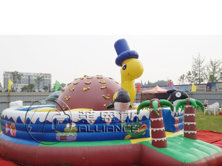 產品名稱:快樂海龜充氣城堡產品規格:6x3m(直徑*高)產品材料:0.48±0.02mm環保夾網PVC配置:風機、布料、膠水 供氣方式:風機連續供氣使用壽命:12-14萬人次保修期:充氣城堡整體提供三年質量保障,三年內免費提供布料,膠水。業務經理跟蹤服務,幫助客戶解決經營中出現的疑難問題。產品描述: 快樂海龜充氣城堡在圓形充氣城堡中設置一只烏龜,烏龜身體是一座充氣攀巖,造型可愛有趣,非常吸引小朋友。適合人群: 適合3-12歲兒童。適用場地: 可用于城市廣場、公共休閑空地、公園、操場、景區、度假村、幼兒園學校等場地。溫馨提醒: 在購買充氣城堡時,您不但要考慮價格,更要重視質量,優質的材質和工藝能提高產品安全保障和使用壽命!