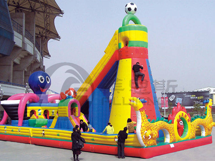 產品名稱:娛樂充氣攀巖城堡產品規格:16*9*9.6/18*10*9.6產品材料:0.48±0.02mm環保夾網PVC配置:風機、布料、膠水 供氣方式:風機連續供氣使用壽命:12-14萬人次保修期:產品整體提供三年質量保障,三年內免費提供布料,膠水。業務經理跟蹤服務,幫助客戶解決經營中出現的疑難問題。產品描述: 此款充氣攀巖城堡以雙龍為門,城堡內有總高度9.6m的充氣攀巖塔,供挑戰者攀爬。塔身后側是充氣大滑梯,充氣城堡更后是一只充氣式章魚。此款充氣城堡造型豐富,玩法多樣,有一定挑戰性,參與者需爬上充氣攀巖方可從充氣滑梯滑下。玩法相對更加多樣,深受攀巖者的喜愛。適合人群: 充氣攀巖城堡適合6-20歲青少年適合場所: 充氣攀巖城堡可用于城市廣場、公共休閑空地、公園、操場、景區、度假村、學校等場地。溫馨提醒: 在購買充氣攀巖城堡時,您不但要考慮產品的價格,而且還要考慮產品的質量,優質的材質能提高產品安全保障和使用壽命!