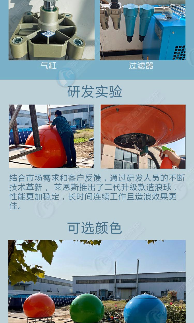 造浪球是全新概念的泳池造浪設備,它通過球體在水中的上下跳動產生漸進的波浪運動,從而將平靜的泳池水變成波瀾起伏的狀態。這種設備不僅提供了模擬大海海浪的體驗機會,還能根據需要調節浪花的大小。增加泳池游玩的