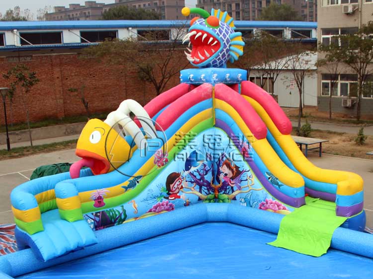 產(chǎn)品名稱:食人魚充氣水滑梯產(chǎn)品規(guī)格:8*6.2*6.2m選配水池:充氣水池產(chǎn)品材料:一等環(huán)保夾網(wǎng)pvc配置:風(fēng)機(jī)、布料、膠水充氣方式:連續(xù)性充氣使用壽命:10-12萬人次保修期:3年產(chǎn)品描述: 食人魚充氣水滑梯描述一條食人魚立在滑梯頂端,爬梯中間是半條只剩骨架的魚身,小朋友通過魚骨架下邊攀爬到滑梯頂端,從側(cè)面滑下,過程驚險刺激。適合做為移動水上樂園設(shè)備。適合人群: 3-16歲兒童適用場地: 可用于城市廣場、公共休閑空地、公園、操場、景區(qū)、度假村、體育場館、城鄉(xiāng)結(jié)合空曠處和小河、湖泊、海邊等區(qū)域,無需基建,設(shè)施可移動組合,不長期占用、傷害場地。溫馨提醒 在購買充氣水滑梯時,您不但要考慮價格,更要重視質(zhì)量,優(yōu)質(zhì)的pvc材質(zhì)能提高產(chǎn)品安全保障和使用壽命。