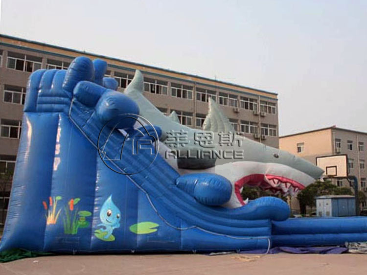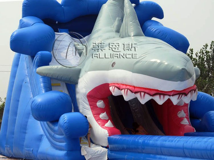 產品名稱:鯊魚充氣水滑梯產品規格:20*9*9m選配水池:充氣水池產品材料:一等環保夾網pvc配置:風機、布料、膠水充氣方式:連續性充氣使用壽命:10-12萬人次保修期:3年產品描述: 鯊魚充氣水滑梯血口大張,氣勢兇猛,好像躍出海面要吃掉靠近的敵人。夸張的造型非常吸引成人和兒童,適合連接充氣水池做為移動水上樂園設備。適合人群: 3-16歲兒童適用場地: 可用于城市廣場、公共休閑空地、公園、操場、景區、度假村、體育場館、城鄉結合空曠處和小河、湖泊、海邊等區域,無需基建,設施可移動組合,不長期占用、傷害場地。溫馨提醒 在購買充氣水滑梯時,您不但要考慮價格,更要重視質量,優質的pvc材質能提高產品安全保障和使用壽命。