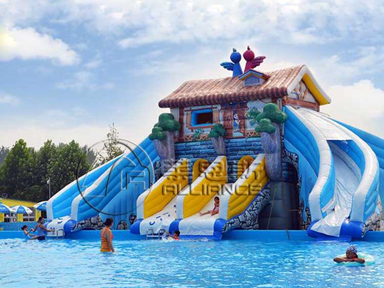產品描述:移動水上樂園主要由充氣水滑梯搭配支架游泳池和充氣游泳池,分為深水區和淺水區,配合多種水上充氣玩具組建而成。這些水上樂園設備造型逼真,趣味豐富,玩法多樣,深受家長和孩子喜愛,滿足家庭親子嬉水需要!