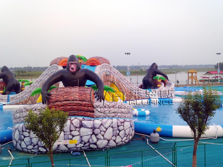 產品描述: 主題以3只黑猩猩搬運溪流中木桶活動為主題內容,環形坡度溪流巧妙設計為水上滑梯,滿足小朋友在溪流中滑滑梯的樂趣,溪流末端轉彎處連接大型充氣水池,可以直接滑到水池中。溪流較高處下面又設計縱向山洞,容小朋友在3個水池之間快捷穿梭,樂趣無窮。非常適合做為移動水上樂園那設備。