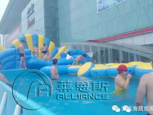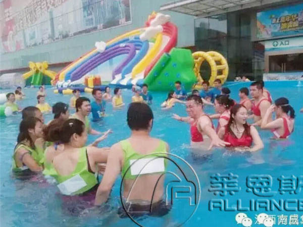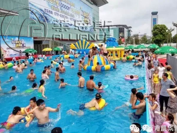 華南城水上樂園是以大小、形狀、深度不同的支架水池、充氣水池為構架,以彩虹滑梯、大象滑梯、龍頭滑梯、水上沖關為刺激源。豐富多彩的浮具為點綴,結合不同的動漫文化元素,充分利用充氣游樂產品形象描敘準確、功能易于安全完滿實現(xiàn)等特點制作而成的具有一文化動漫表現(xiàn)內涵的主題游水、嬉水樂園。